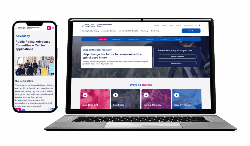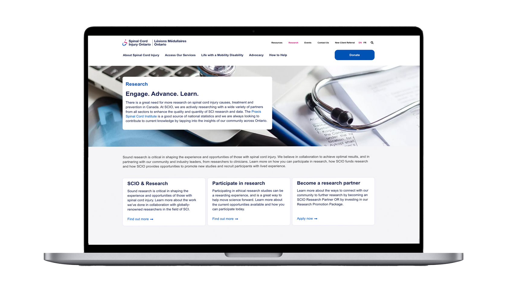 SCIO’s legacy website presented significant accessibility barriers, lacked intuitive navigation, and failed to support their growing content and fundraising needs effectively. They required a comprehensive redesign to ensure full compliance with AODA and WCAG 2.1 AA standards, robust bilingual content support, and seamless integration with Blackbaud Raiser’s Edge for improved donor management and streamlined online fundraising.